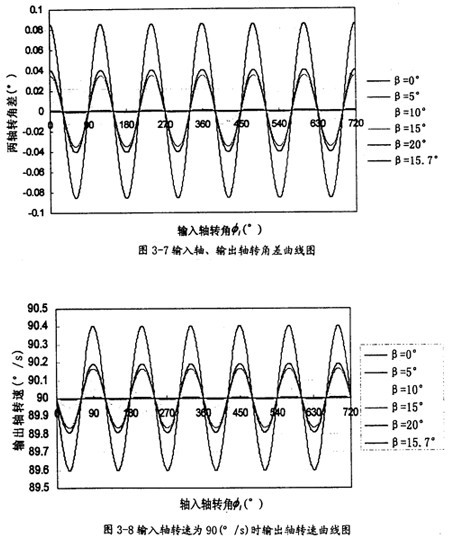 由曲线图3-7可以看出两轴的转角差相当小,即使在两轴夹角达到2oo时,输入同输出的最大转角差也不到o.1o,所以在一定的程度上认为输入、输出转角相同是有一定的道理的。且转角随两轴夹角β的增大而增大,变化的频率为一个回转周期3次。