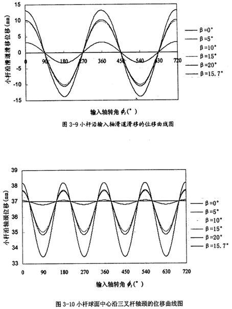 由曲线图3-9可以看出,小杆沿滑道的位移随两轴夹角β的增大而增大,变化量也比较大,变化频率为一个回转周期1次。这可以作为三叉杆万向联轴器设计中,小杆长度的设计依据。