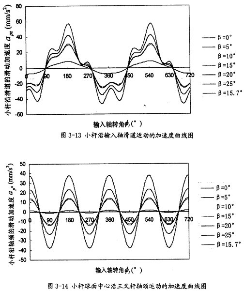 由曲线图3-14可以看出,小杆球面中心P沿轴颈的线加速度,变化频率为一个回转周期2次。随两轴夹角β的增大其最大值增长较快,它的值可以作为动力分析和设计计算的重要依据。