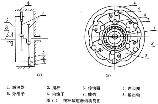 文献只提出了摆杆活齿传动的一般结构方案,要把这种方案变为实际产品,还有许多理论问题需要解决。例如对机构传动特性的分析,效率计算,强度校核,以及内齿圈齿廓的测量等等。本章从摆杆减速器的传动原理着手,对这些问题进行了详细的分析讨论,为摆杆减速器的制造奠定了理论基础。