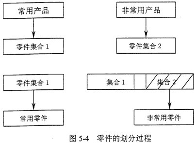 划分常用零件与非常用零件的依据是:详细划分各种系列产品中对应的零件,分为常用要求和非常用要求二种状态,常用要求下对应下的零件集合为常用零件:非常用要求下对应下的零件集合,减去常用零件集合为非常用零件,即扣除常用零件便得非常用零件。具体过程见图5-4。