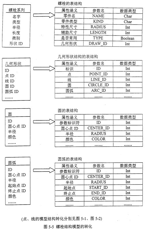 在工程数据库中,数据库的对象模型参数有:零件名、零件类型、零件特性尺寸、是否常用、零件辅助尺寸、零件的几何形状。其中,零件特性尺寸是确定具体类型的要素,而零件的几何形状是零件图形单元的绘制的依据,是对零件拓扑关系的描述。下面以螺栓系列为例,由数据模型向表结构进行转换,从复杂的结构层层转化为单一的结构,进行详细的叙述,见图5-5。