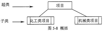 3、概括(Generalization):定义类型之间的一种子集联系。它抽象了类型之间的“is ubset of”的语义。例如项目是个实体型,机械类项目也是实体型,化工类项目也是实体型。机械类项目、化工类项目均是项目的子集。我们把项目称为超类(Superclass),将机械类项目、化工类项目成为项目的子类(Subclass),见图5-8。