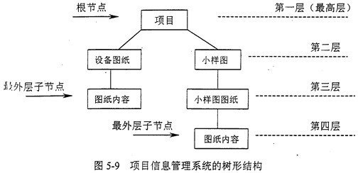 对于项目信息管理系统,有自己的特殊性,从逻辑结构上说,他是一个典型的树型结构,每个节点除根节点外,有自己的子节点;每个节点除最外层子节点外,有自己的父节点。在本系统中,项目是整个树结构的根节点,而个图纸内容是最外层子节点,项目是设备图纸和小样图的父节点,图纸、小样图又是图纸内容的父节点,见图5-9。