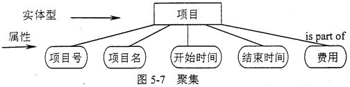 2、聚集(Aggregatopm):定义某一类型的组成部分。她抽象了对象内部类型和成分之间“is part of”的语义。在E-R模型中若干属性的聚集组成了实体的就这种抽象。如图5-7。