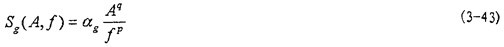 对于(3-22)模型,我们用阻尼耗能的能量关系来辨识阻尼力与振幅和频率的关系。在前面,迟滞回线面积(即阻尼耗能)与振幅的函数关系已建立起来,见(3-38)式,而且式中参数也已辨识出。同样,用数值积分,可以算出振幅一定,频率变化时迟滞回线的面积,由此得出迟滞回线面积与频率的对应关系,将这些对应关系画成曲线如图3-6中大圆点曲线所示。由迟滞回线面积随频率变化的规律分析,可建立其函数关系为: