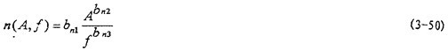 (A,f,x, )是振幅A、激励频率f、瞬态位移x和瞬态速度 的函数,或者说恢复力Q是刚度函数K1(A),K3(A),K5(A)和阻尼函数C(A,f)以及阻尼成分函数n(A,f)的函数,其中阻尼成分函数n(A,f)描述阻尼的组成情况,n(A,f)=0时,阻尼为干摩擦阻尼,n(A,f)=1时,为粘性阻尼,0<n(A,f)<1时,阻尼由粘性阻尼和干摩擦阻尼组成,n(A,f)>1时,阻尼成为“高阶”阻尼。对于(3-47)式,当振幅与频率一定时,式中的Kl(A),K3(A),K5(A)和n(A,f)均为定数,当振幅A和频率变化时,它们均是函数,因此参数辨识实质上是参数函数的辨识。首先我们用非线性参数辨识方法Marquardt法,根据试验所得的数据,按照(3-47)式对每一迟滞回线进行参数辨识,可以得到对应的K1(A),K3(A),K5(A),C(A,f)和n(A,f)值,对每种工况下的数据随振幅和频率变化趋势进行分析后,可以建立刚度函数、阻尼函数和阻尼成份函数的数学表达式为:
