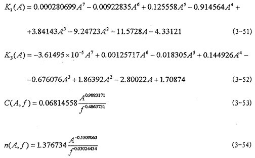 然后用线性参数辨识法和非线性参数辨识法,根据上面已经得到的各个工况下K1(A),K3(A),K5(A),C(A,f)和n(A,f)的数值对(3-48)、(3-49)、(3-50)式中各参数进行辨识,将辨识得到各参数代入(3-48)、(3-49)和(3-50)式得:
