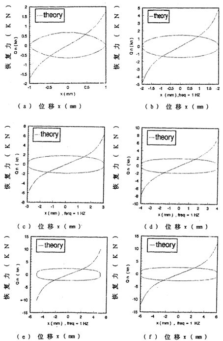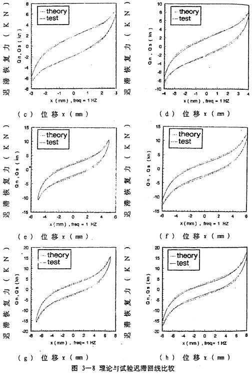 由数学模型(3-47) 计算可以得到不同激励频率和振幅下联轴器恢复力迟滞回线数据,为了证实(3-47)的正砷性,下面画出频率为1赫兹、振幅为1~8毫米各工况下数学模型计算的理论数据和试验数据表示的迟滞回线图,如图(3-8)(a)~(h)(见51~52页)所示,图中虚线为理论回线,实线为试验迟滞回线。从图中可知,理论迟滞回线十分接近试验迟滞回线,由此可以说明建立的联轴器数学模型(3-47)式可较好地描述恢复力随振幅A频率f、瞬时位移x和速度分变化的规律,较圆满地解决了联轴器恢复力建模与参数函数辨识的难题。