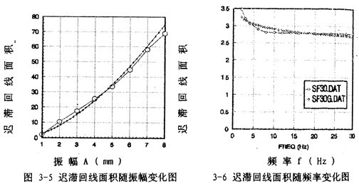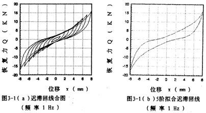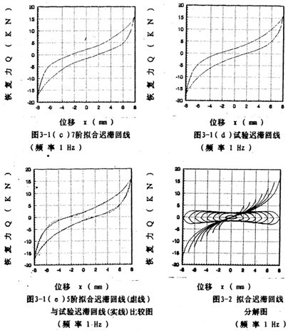 为了说明5阶和7阶幂函数多项式拟合的精度情况,以振幅A=8毫米,频率为1赫兹为例,画出拟合回线分别如图3-1(b)、3-1(c)所示,将它们与对应试验回线图3-1(d)比较,可知7阶拟合精度高于5阶。图3-1(e)为图3-1(b)与图3-1(d)的合图。