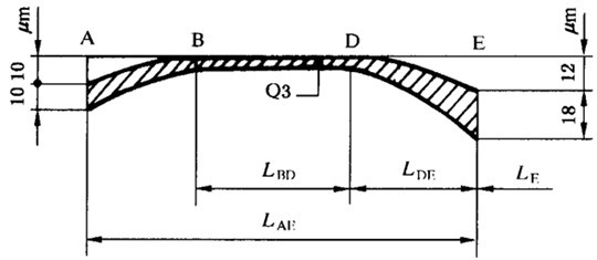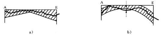 在线图中,未修整齿面的螺旋线迹线是用一条直线来表示,而鼓形齿的齿面其相应的迹线是弓形曲线,在线图中,鼓形齿齿面的设计螺旋线和平均螺旋线变线通常是抛物线(见图23)。