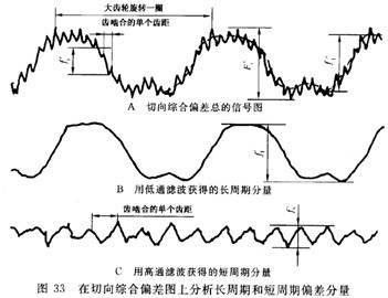 重要的事是记住,在滤掉长周期分量后,一齿切向综合偏差fi′(图33A)实际上变小了,这样真正的最大偏差fi′就未必能在经滤波后的短同期分量的曲线(图33C)中表示出来。