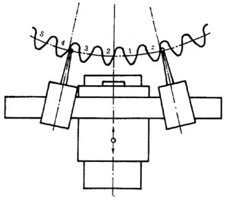 取在直径上对置的同侧位置的齿面,从其螺旋线图上可以获得适用的平均值,然而,如螺旋线倾斜偏差沿齿轮圆周变化时,则必须至少取三个均布齿面的迹线。否则其偏差不一定能被发现。