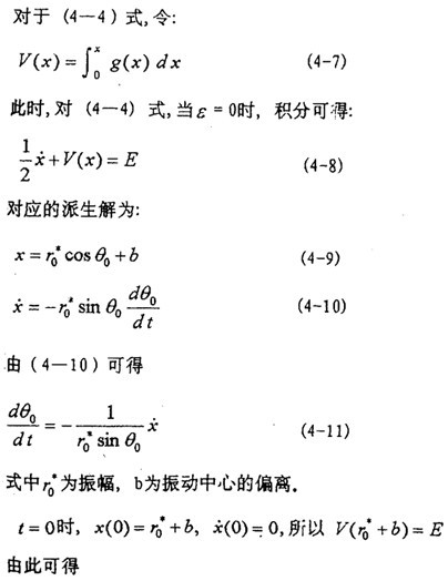 目前文献上的一些方法对于弱非线性系统是有效的,而对于(4-2)式的强非线性系统则遇到了麻烦。由于描述非线性振动系统的微分方程种类繁多,没有普遍的解法,因此,仍然只有极少非线性振动方程可求得精确解。可行的办法是针对不同非线性振动方程的特点寻求一些近似数值解法。为研究方便,将(4-2)式进一步写成以下形式: