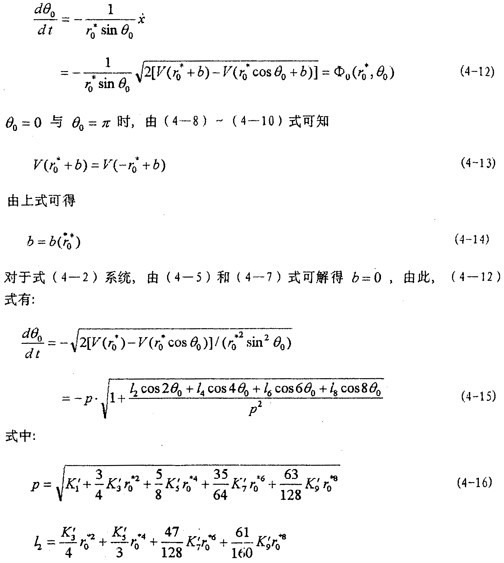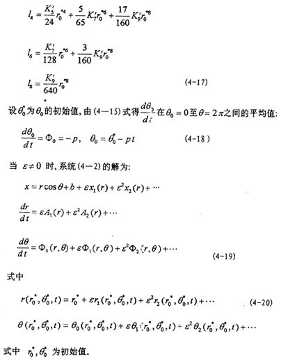 在非线性振动系统中,当系统受到周期性外力作用的情况下,有可能产生三类运动,非共振运动,共振运动,由非共振运动到共振运动的过渡过程,即瞬态运动。对于共振运动来说,有三类,(l)m=n,即ω=p,这是通常所说的共振,称为主共振,(2)n=1,ω=mp,产生泛音共振,当m为奇数时,产生次谐波共振,(3)m=1,ω=p/n,当n为奇数时,产生超谐波共振。将幕级数形式的dθ0/dt代人(4-40),并计算该式在O-2区间的定积分,可以得出结论:只有当n=1,m=±1,±3,±5,±7,……时才可能得到(4-2)的周期解,并且(4-2)式只可能产生主共振解和次谐波共振解。