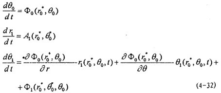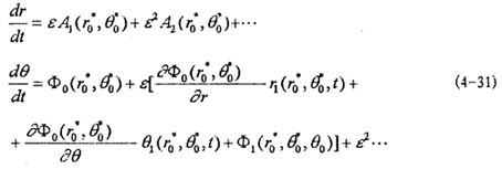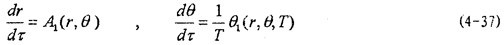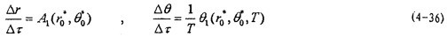 这就是对应于(4-20式的频闪差分方程,即(4-2)式在Poicare平面上以T为周期的点变换方程。如ε充分小,则可令△τ=dτ,△r=dr,△θ=dθ,此外,(4-36)中的