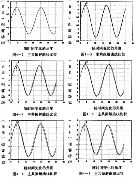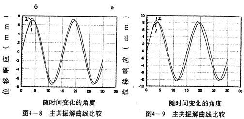 =2时两者的重合性很好。(2).随着振幅的增大,解析解曲线1和仿真解曲线2在相位上产生微小变化,解析解的相位超前仿真一个小量,原因是随着振幅的增大,系统呈现更为强烈的非线性,而在推导中略去了高次项,但还是可以满足工程的要求。(3)从(4-78)-(4-85)式中的各δ值可知,在联轴器产生主共振的情况下,激振力很小。