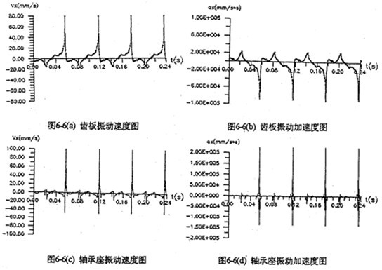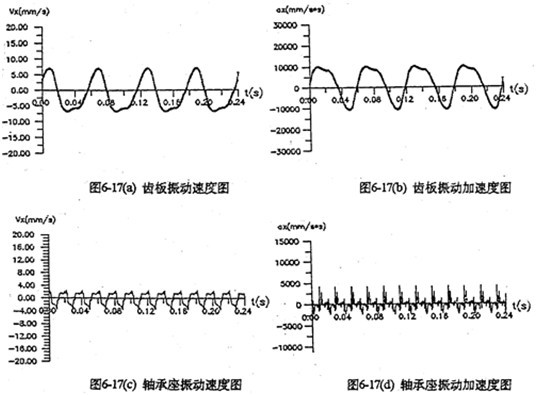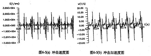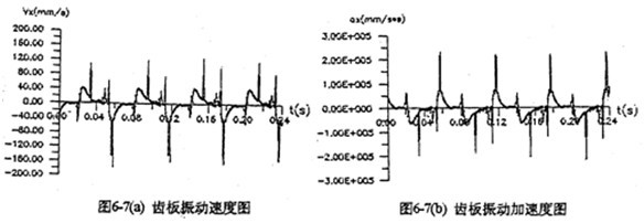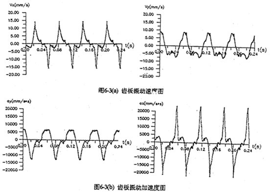 图6-7是某相双曲柄机构在输入端具有0.03mm间隙时,齿板及轴承座的振动速度、振动加速度。图中表明,速度、加速度都在两个死点位置出现较大的冲击值。