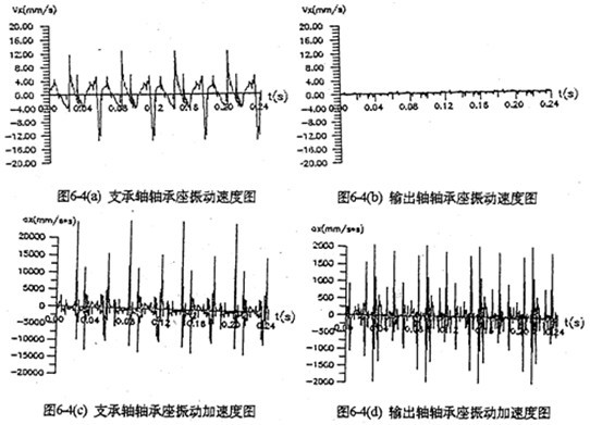 输出轴轴顾座的振动速度及加速度都比支承轴或输入轴轴承座的小10倍左右,其最大值为