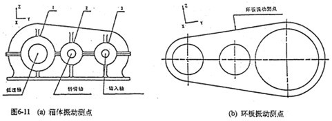 为了将理论分析的结果与振动测试分析结果对比印证,将测点选在三个箱体轴承座及齿板支承轴孔的上边缘,如图6-11所示。