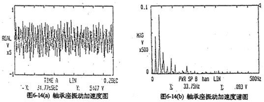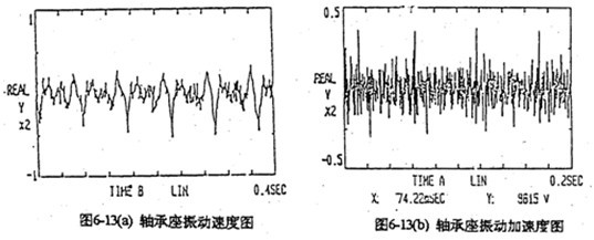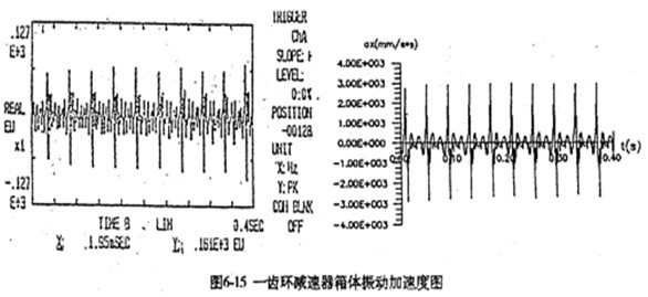 由于每片齿板都存在同样的周期性激励冲击函数,相位差120°,迭加后的总效果仍然是转频周期函数。因此对箱体轴承座的冲击也呈周期性。图6-13是支承轴箱体轴承座的振动速度及加速度的实测时域曲线图。其曲线图的变化规律及幅值与图6-4完全接近。速度及速度冲击值为