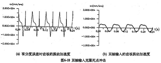 采用双轴输人的齿板及箱体轴承座振动速度、加速度如图6-17所示。从图看出齿板速度及加速度值明显变小(为单轴输人时的0.3倍),而且无冲击,完全属于稳太振动。箱体的振动速度及加速度幅值只是单轴输人时的0.2倍。图6-18a是一轴的偏心套存在0.05度的分度误差时齿板的加速度曲线图,图中明显出现加速度冲击棒线。采用双轴输入后,死点冲击被彻底(见图6-18b) , 变成稳态振动曲线了。因此,为了减小三环减速器的振动,有必要加大三环减速器的横向尺寸,在箱体内增加一套双轴输入的齿轮功率分流机构,或者在箱体外另设计一套功率分流机构,以解决机构过死点的振动问题。