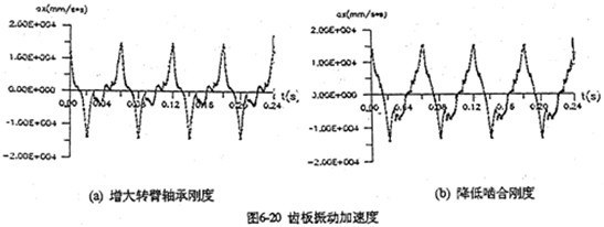 增大行星轴承刚度的目的在于减小双曲柄机构的变形,降低死点冲击幅值。并且使各相啮合力均衡化、减小啮合冲击。图6-20是分别将行星轴承刚度增加一个数量级和内齿圈降低一个数量级时齿板的振动加速度。两者加速度幅值均降低了1/4 倍左右。