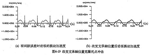 在上一章已经分析过,当三轴水平布置而且高速轴在输出轴的同侧时,载荷幅值最大,各相啮合力等都很不均衡(见图5-24)。图6-19是将支承轴布置在输入轴与输出轴间的150°位置时齿板的振动加速度。由图可知,因误差引起的冲击已被完全克服,而且原有的稳态幅值也降低了很多。