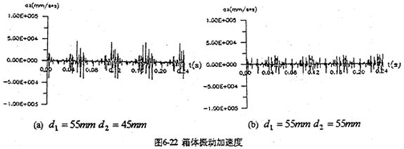 增加高速轴的刚度是降低冲击载荷的重要途径。轴的刚度大(值径大),扭转、弯曲变形小,双曲柄机构变形也就小,这样既减小了冲击振动、又增加了轴的强度。图6-22将高速轴的直径由原来的45mm加到55mm后的,振动加速度图。
