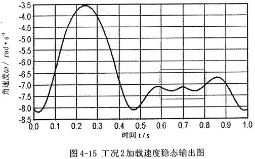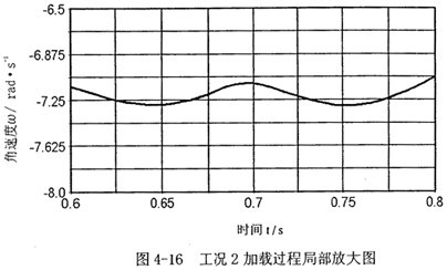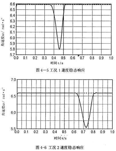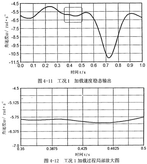 图中虑线表示空载情况下ω的稳态响应,可见很快达到稳定,速度滤动很小,实线表示加载过程ω的稳态响应。显然,在加载时段,当载荷骤增时,会导致速度大幅降低。