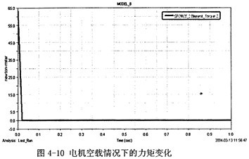 再看电机的状态,如图4-9所示,电机在只驱动柔性速度补偿装置,不加前面所示的负载时,电机输出的速度波动很小,很快就达到平衡,电机的驱动力矩也很快达到稳定,且力矩波动微小,如图4-10所示。