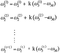 设ω1、ω2、ω3、k分别为常速电机输入速度,伺服电机的输入速度,输出速度,理论输出速度(理想值)和加权因子,e为输出速度和理论输出速度值的误差范围。迭代周期以常速电机旋转一周(2π)为一周期,迭代进行一次。