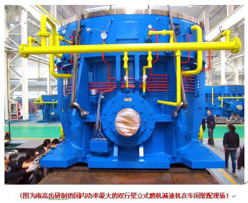 2011年11月,南京高精传动设备制造集团有限公司(简称:南高齿)子公司南京高精齿轮集团有限公司自主研发制造的国内功率最大的双行星立式磨机减速机成功试车。该减速机型号为MLXSS540,输入功率5400kW,各项试验性能优秀,目前已交付客户使用。此前,国内首台3600kW双行星立式磨机减速机亦是由南高齿研制。