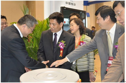 原国务院国资委监事会主席乔龙德、中材国际工程股份有限公司副总裁方芳在展台前