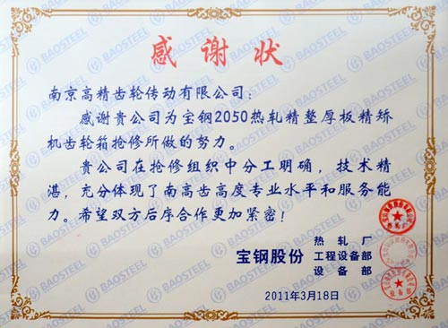 最终,在南高齿生产和技术部门的紧密配合下,经过一个月的紧张抢修,南高齿比宝钢要求的3月21日,提前一天完成了齿轮箱的修复,受到宝钢有关领导部门的表彰。
