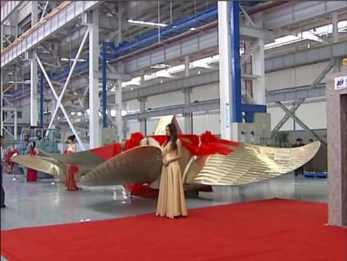 庆典上镇江同舟螺旋桨有限公司董事长陈永道先生代表镇江同舟公司全体员工,对出席开业庆典的各位领导和来宾以及社会各界朋友对同舟公司的支持和厚爱表示诚挚的感谢!同时,对公司发展情况做了简要介绍,他表示目前公司在手的大型螺旋桨订单近50 套,并具备年产定距桨成品6000 吨、可调桨600 套的生产能力,其中单件净重可以达到100 吨、直径11 米。