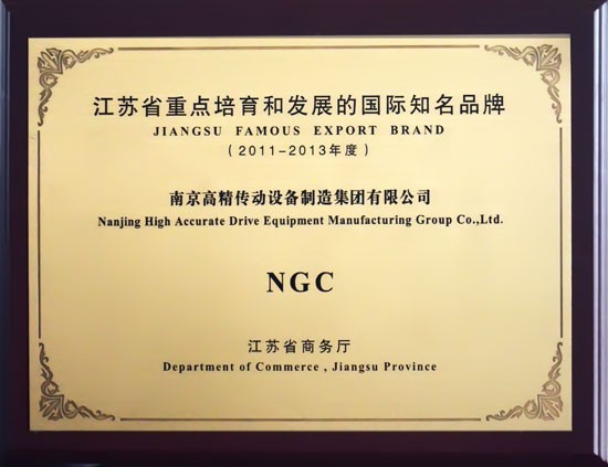 江苏省商务厅于2011年8月15日上午在南京状元楼酒店隆重召开全省出口品牌工作会议,省领导、省商务厅及省有关单位领导为“2011-2013年度江苏省重点培育和发展的国际知名品牌”企业授牌,南京高精传动设备制造集团有限公司(以下简称:南高齿)位列其中。