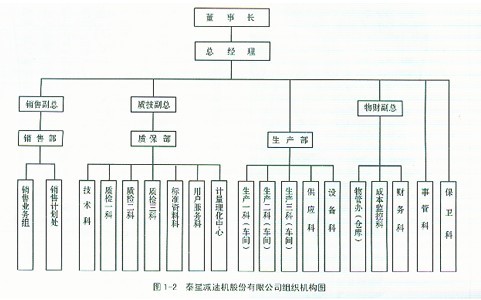 Ⅰ丰硕成果 坐落在中国苏中平原的泰星减速机股份有限公司从1984年建厂,经过20多年的拼搏发展,取得了骄人的业绩,创造了许多令人难以置信的奇迹。 从当初无资金、无设备、无产品、无市场的一穷二白、资不抵债的作坊式小厂发展成为现拥有固定资产3.8亿元,员工2500多人,其中一程技术人员586人,占地68万平方米的中国最大的减速机制造企业,成为了中国减速机的生产基地,泰星减速机股份有限公司。根据2003年中国机械500强的排序,名列全国减速机行业榜首。 公司生产减速机不仅产量最高,销量也最大。2004年,公司的销售收入为5.5亿元,主要产品的市场占有率高达25%,已经连续11年名列全国同行首位。 20年前公司为社会创造了33亿4千多万元的财富,向国家交纳了近4亿元的税金。 公司的产品遍布全国各地,并已走向德国、日本、美国等机械强国,国家的重点工程项目,从三峡水利工程,江阴长江大桥建设工程,黄河小浪底工程,葛洲坝工程,西气东输工程到南水北调工程等都在使用泰星的产品。 泰星减速机股份有限公司组织机构图见图1-2。在公司目前的2500多名员工中,有50%为当地农民,大专以上学历的仅占20%,其余的皆为初、高中以下学历,但他们却生产出了国内领先、国际一流的产品。 泰星牌减速机成为中国减速机行业惟一的国家“121”重点保护名优产品。
