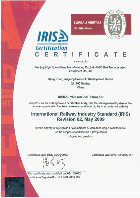 2011年10月份南京传动轨道交通设备有限公司拉开了IRIS体系建立的序幕,公司管理层选择了“上海敏通咨询公司”作为IRIS 体系推进的咨询公司,选择“BV Certification”对我公司的IRIS 体系进行认证。Bureau Veritas专家组对公司包括IRIS体系的12个K O项、体系文件、KPI指标、内审、管理评审等在内的IRIS标准所有条款进行了严格审核,专家组成员对审核的过程和审核的结果均表示满意,并充分肯定了公司管理水平及为IRIS体系实施所做的工作,公司最终以高分通过IRIS 体系的审核。