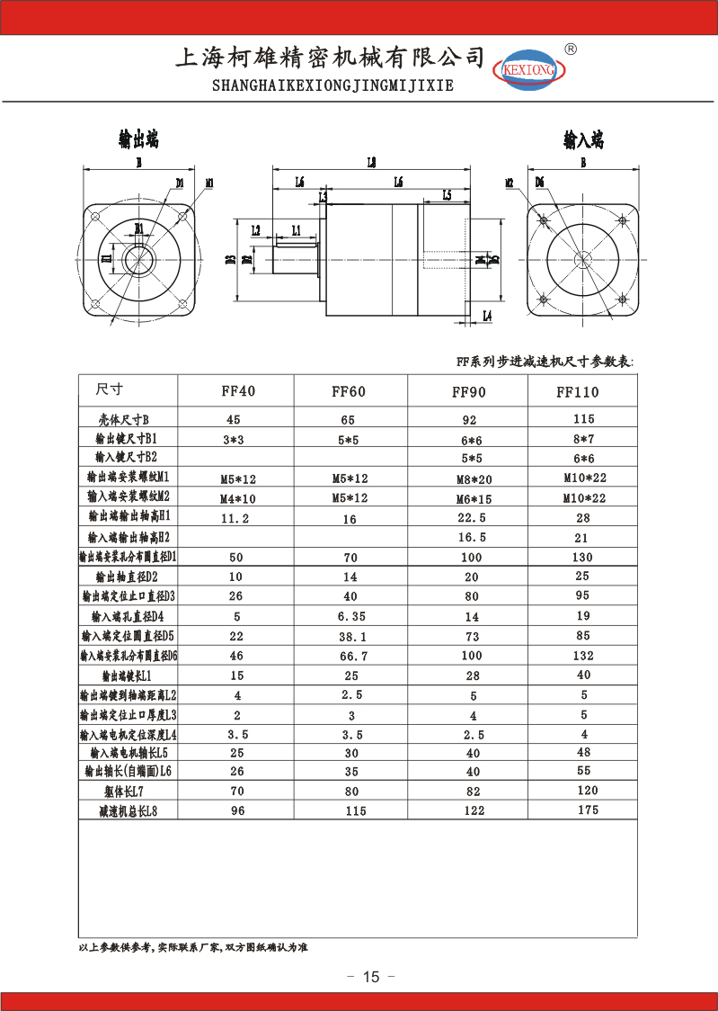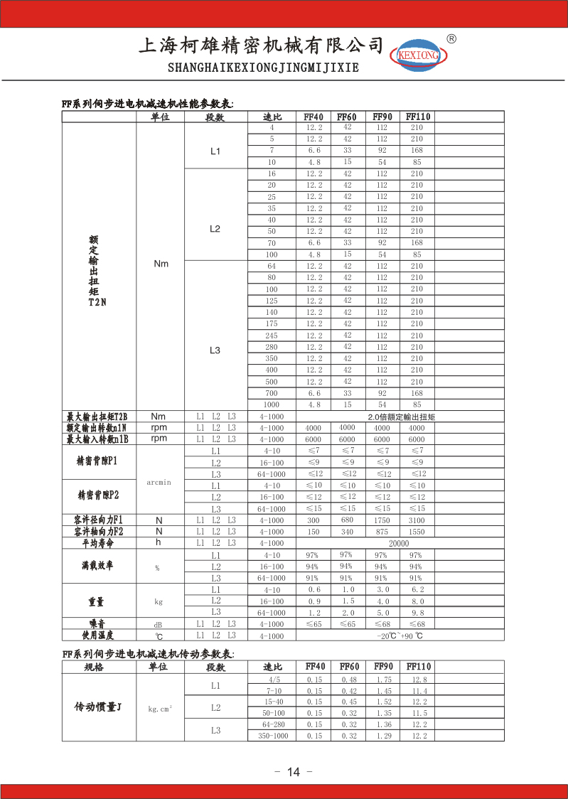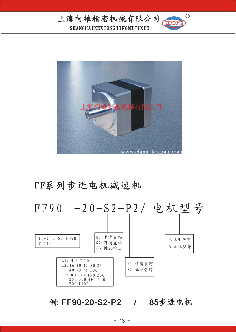 FF系列步进电机减速机:FF40、FF60、FF90、FF110、同轴式机座型号,速比:3-1000有20多个比速可选择;分一、二、三级减速传动;精度:一级传动精度在8-10弧分,二级传动精度在6-8弧分,三级传动精度7-10弧分;等一千多种规格。