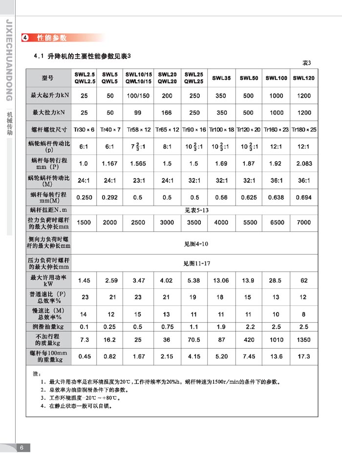 QWL系列蜗轮丝杆升降机是一种基础起重部件,已列为JB/ZQ4391-86标准。承载能力2.5-120T。具有结构紧凑,体积小,重量轻,动力源广泛。无噪音,安装方便,使用灵活,功能多。配套形式多,可靠性高,使用寿命长等许多优点。具有提升、降落、推进、翻转等多种功能。可单台也可组合使用,可能用电动机或其他动力直接带动,也可手动。有不同的结构型式和装配方式,提升高度可按用户的要求制造,该装置可以自锁。