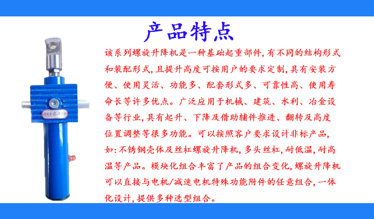 该系列螺旋升降机是一种基础起重部件,有不同的结构形式和装配形式,且提升高度可按用户的要求定制,具有安装方便、使用灵活、功能多、配套形式多、可靠性高、使用寿命长等许多优点。广泛应用于机械、建筑、水利、冶金设备等行业,具有起升、下降及借助辅件推进、翻转及高度位置调整等很多功能。可以按照客户要求设计非标产品,如:不锈钢壳体及丝杠螺旋升降机,多头丝杠,耐低温,耐高温等产品。模块化组合丰富了产品的组合变化,螺旋升降机可以直接与电机/减速电机特殊功能附件的任意组合,一体化设计,提供多种选型组合