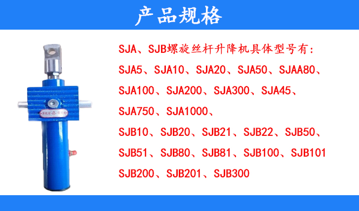 SJA、SJB螺旋丝杆升降机具体型号有:SJA5、SJA10、SJA20、SJA50、SJA80、SJA100、SJA200、SJA300、SJA450、SJA750、SJA1000