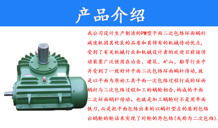 我公司设计生产制造的PW型平面二次包络环面蜗杆减速机因其优良的品质和其特有的机械传动优点,受到了有关机械行业和机械设计者的欢迎目前该传动装置广泛使用在冶金、建筑、矿山、船等行业中并受到了一致好评平面二次包结环面蜗杆传动,就是以平面为原始工具平面一次包络过程行成的环面蜗杆与二次包络过程加工的蜗轮相合,构成的平面二次环面蜗杆传动。也就是加工蜗轮时不是用单面铁刀,而是把平面包络出来的以蜗杆型左的滚到包络出蜗轮的轮话来实现了对轮的再包络(或称为二次包络)