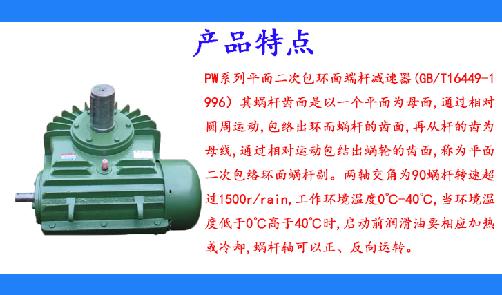 PW系列平面二次包环面端杆减速器(GB/T16449-1996)其蜗杆齿面是以一个平面为母面,通过相对圆周运动,包络出环而蜗杆的齿面,再从杆的齿为母线,通过相对运动包结出蜗轮的齿面,称为平面二次包络环面蜗杆副。两轴交角为90蜗杆转速超过1500r/rain,工作环境温度0℃-40℃,当环境温度低于0℃高于40℃时,启动前润滑油要相应加热或冷却,蜗杆轴可以正、反向运转