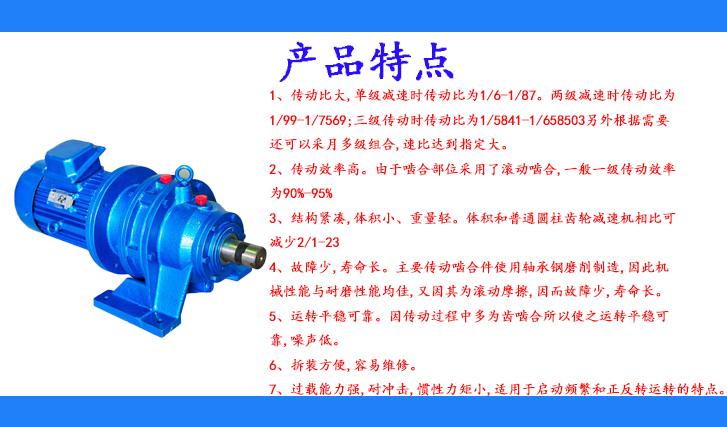 3.体积小重量轻:由于不仅采用了行星传动原理、输入轴和输出轴在同一轴线上,而且有与电动机直联呈体的独特之处,因而本机具有结构紧凑、体积小,重量轻的特点