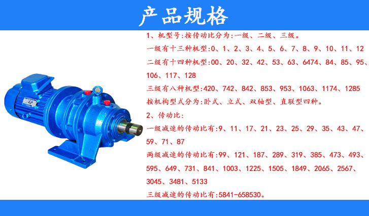 行星摆线针轮减速机全部传动装置可分三部分:输入部分、减速部分、输出部分、按结构形式分为:卧式立式、双轴型、直联型四种。我厂除生产标准减速机外,还可满足用户需要承接非标设计制造potoo oe oae直联型减速机与Y系列专用电动机及Y系列派生专用电动机组装在一起,如YA增安型电动机、YB防爆电动机、YCT调速电动机、YE制动电动机等。