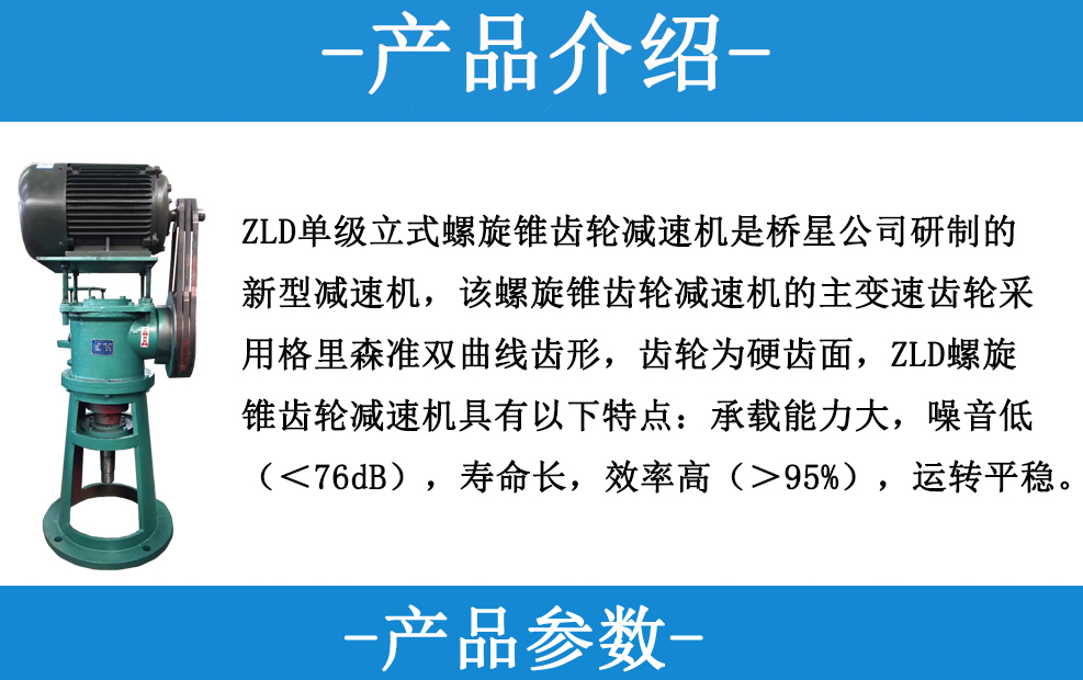 ZLD单级立式螺旋锥齿轮减速机是桥星公司研制的新型减速机,该螺旋锥齿轮减速机的主变速齿轮采用格里森准双曲线齿型,齿轮为硬齿面