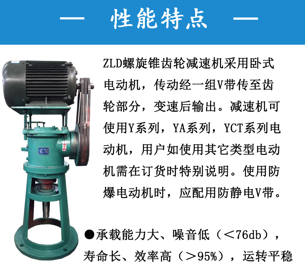 ZLD螺旋锥齿轮减速机具有以下特点:承载能力大,噪音低(<76dB),寿命长,效率高(>95%),运转平稳。