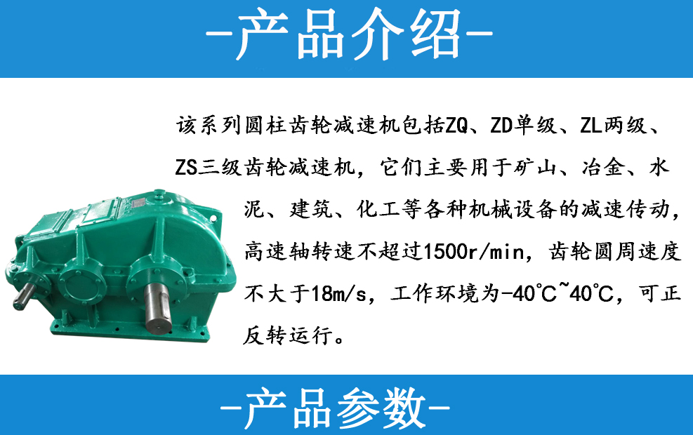 该系列面柱齿轮减速机包括ZQ、ZD单级、乙L两级、ZS三级齿轮减速机,它们主要用于矿山、冶金、水泥、建筑、化工等各种机械设备的减速传动,高速轴转速不超过1500r/min轮圆周速度不大于18m/s,工作环境为-40℃-+40℃,可正反转运行。